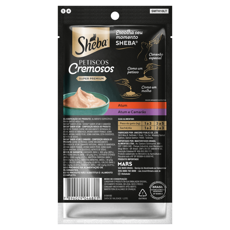 Alimento para Gatos Adultos Atum ou Atum e Camarão Sheba Petiscos Cremosos Envelope 48g 4 Unidades