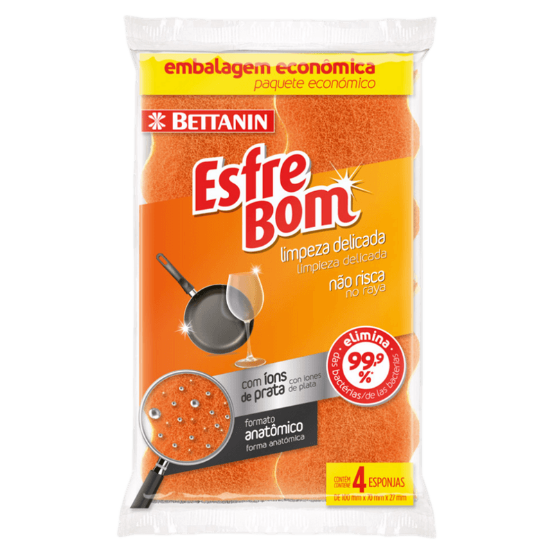 Esponja Anatômica Não Risca Limpeza Delicada com Íons de Prata Esfrebom 4 Unidades Embalagem Econômica
