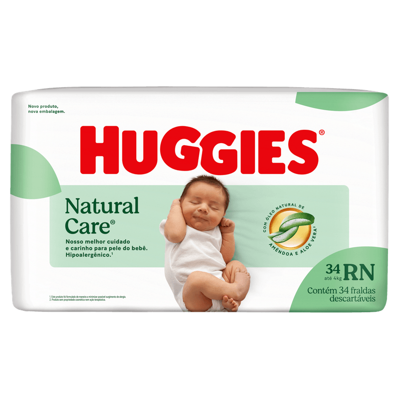 Fralda Descartável Recém-Nascido com Óleo Natural de Amêndoa e Aloe Vera Huggies Natural Care RN Até 4kg Pacote 34 Unidades