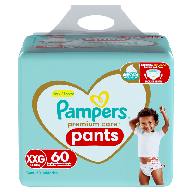 A Fralda Calça Pampers Pants Premium Care possui cintura elástica 360° é fácil de colocar até quando o bebê está em movimento, dando um ajuste perfeito e mantendo a pele seca e protegida. A Fralda Pampers Premium Care Pants possui canais de ar que permitem que o ar circule livremente pela Fralda, para que o bumbum fique menos abafado e a pele fique arejada e sequinha durante a noite. Pampers Pants Premium Care também possui proteção Pampers Premium Care, a proteção mais suave para a pele do bebê, ultra respirável para manter a pele do bebê fresca e loção hipoalergênica que ajuda a prevenir irritações. A Fralda Calça Pampers Pants Premium Care é muito fácil de pôr e tirar basta seguir o modo de uso: 1. Coloque a mão dentro da Fralda; 2. Suba a Fralda como um shortinho através dos elásticos adaptáveis; 3. Para retirar a Fralda rasgue suas laterais e retire-a normalmente; 4. Enrole e feche a Fralda com a fita adesiva da parte de trás. O jeito fácil de trocar.