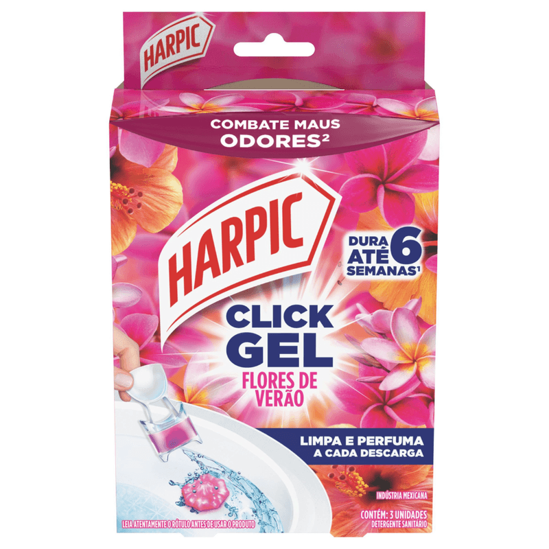 Harpic Click Gel é o detergente de vaso sanitário que limpa e perfuma a cada descarga. Prática e higiênica, cada aplicação dura até 2 semanas¹ e libera fragrância que combate maus odores de banheiro. Disponível nas fragrâncias Flores de Verão e Brisa do Mar.