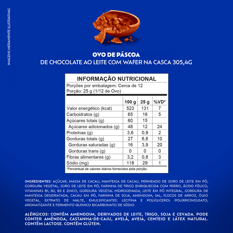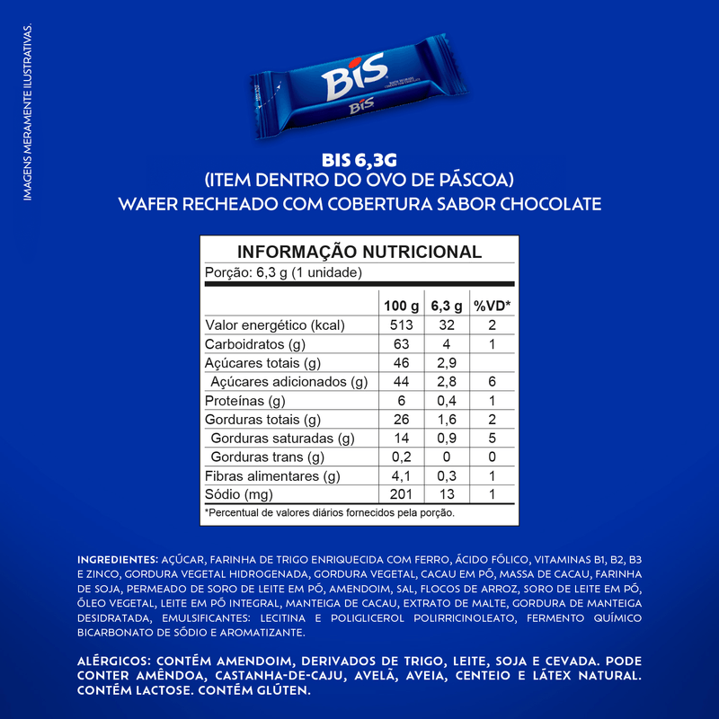 O Ovo de Páscoa Bis ao Leite Lacta 305,4g combina o chocolate ao leite Lacta com pedaços crocantes do clássico wafer Bis na casca. Cremoso e crocante na medida certa, é perfeito para presentear ou compartilhar na Páscoa. Confira tabela nutricional e ingredientes nas imagens. Produto com alto teor de açúcar adicionado e gordura saturada.