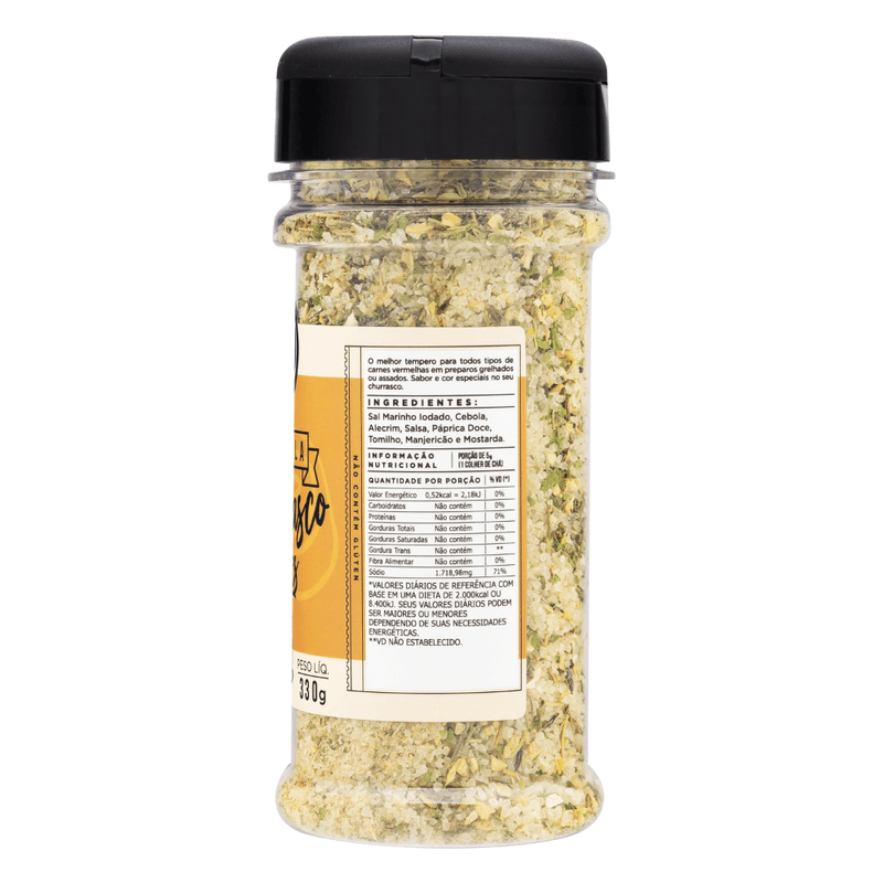 Tempero para todos tipos de carnes vermelhas em preparos grelhados ou assados. Ingredientes: sal marinho iodado, cebola, alecrim, salsa, páprica doce, tomilho, manjericão e mostarda.